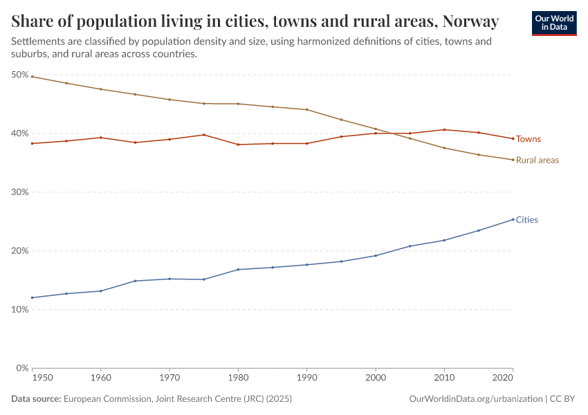 In the chart, you can see how the share of people in Norway who live in rural areas, towns, and cities has changed over time.