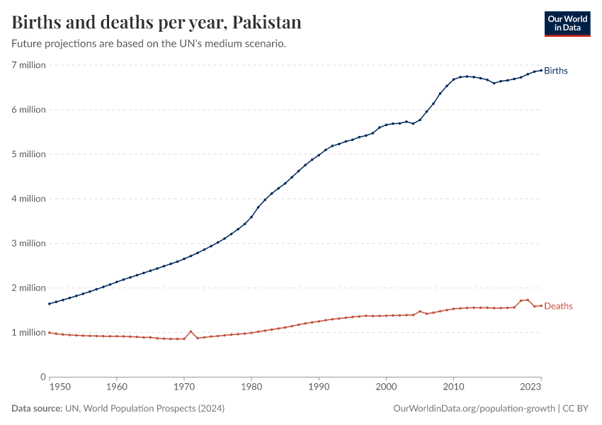 The chart below shows how births and deaths in Pakistan have changed over time.