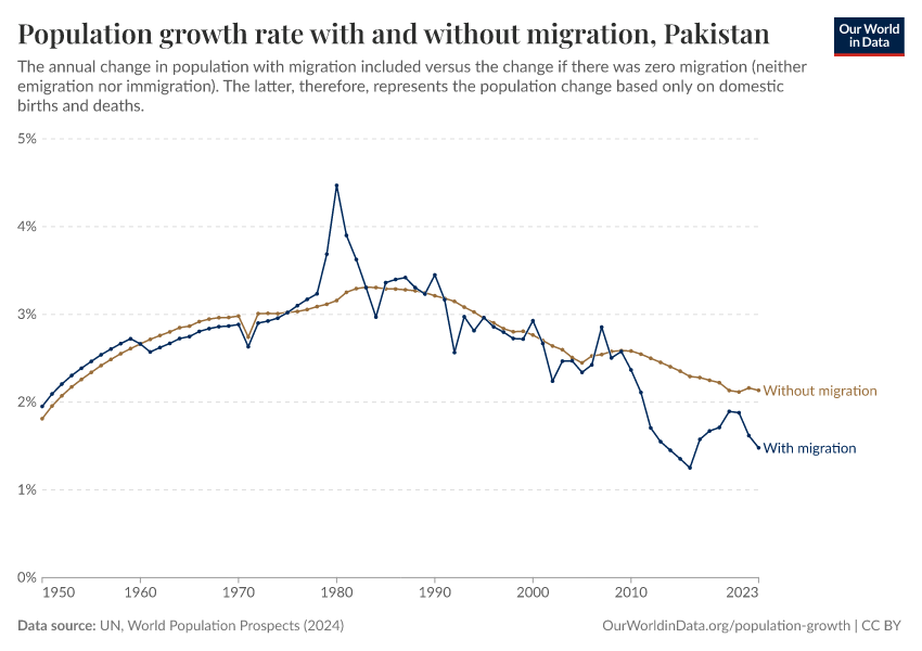 In the chart, you can see Pakistan’s population change with migration, next to a scenario where migration was zero. In this case, population changes would only be determined by births and deaths.
