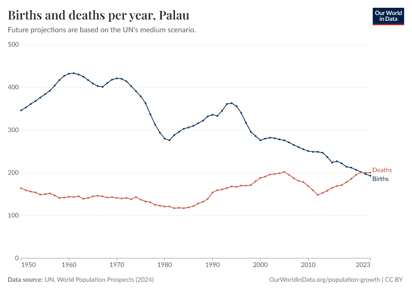 The chart below shows how births and deaths in Palau have changed over time.