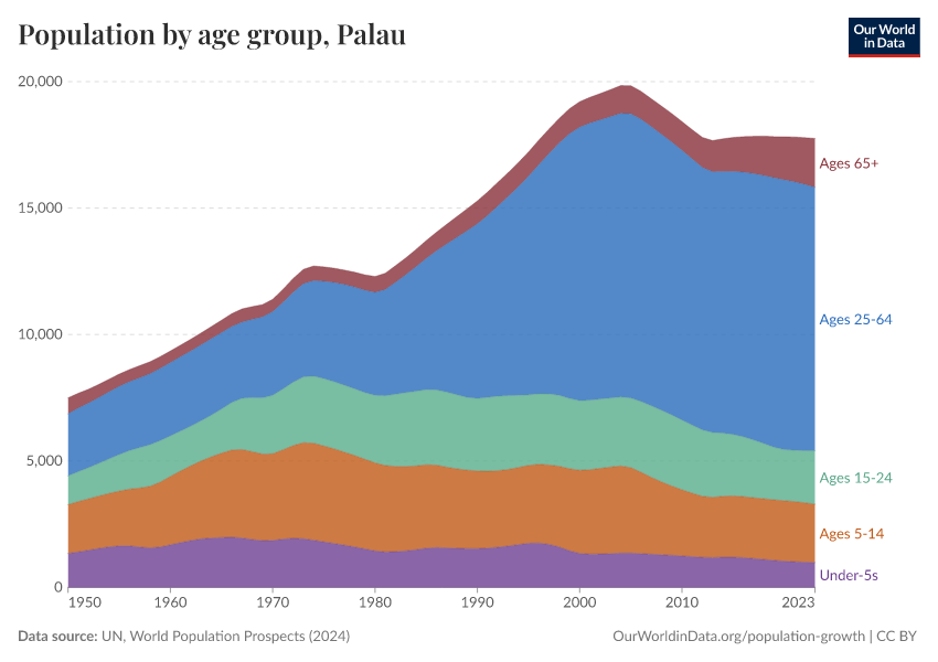 The chart shows Palau’s population broken down by age, and how this has changed over time.