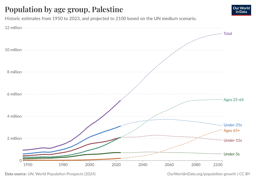 In the chart, you can see its latest medium projection through to the end of the century. In 2023, Palestine’s population was 5.41 million. By 2100, it is projected to be 11.48 million.
