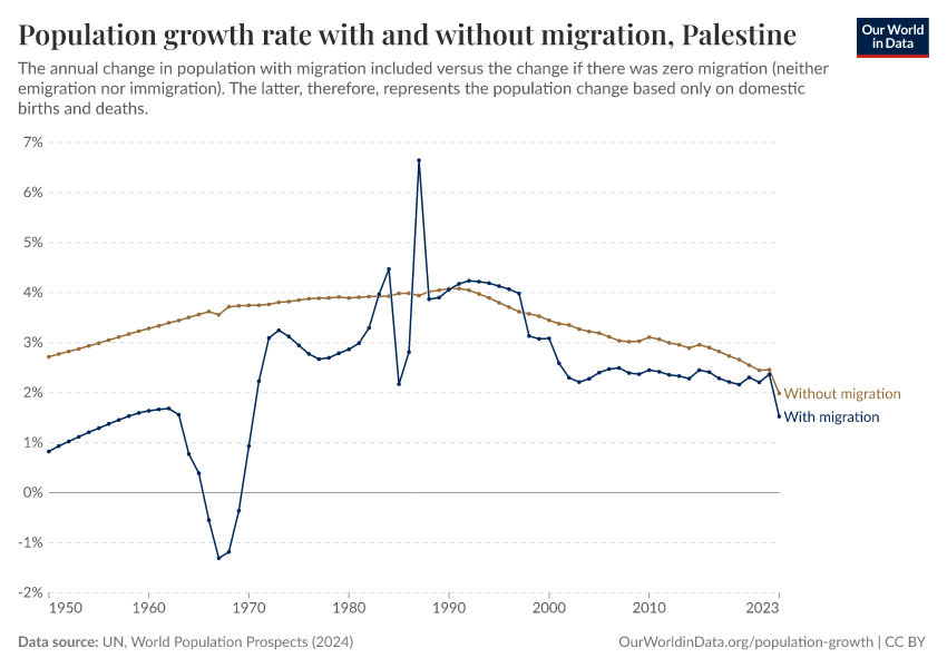 In the chart, you can see Palestine’s population change with migration, next to a scenario where migration was zero. In this case, population changes would only be determined by births and deaths.