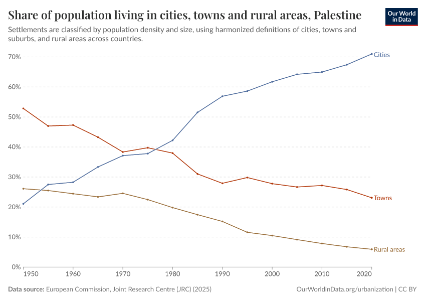 In the chart, you can see how the share of people in Palestine who live in rural areas, towns, and cities has changed over time.