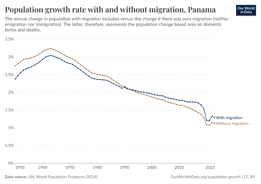 In the chart, you can see Panama’s population change with migration, next to a scenario where migration was zero. In this case, population changes would only be determined by births and deaths.