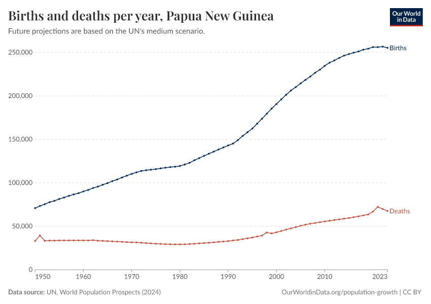 The chart below shows how births and deaths in Papua New Guinea have changed over time.