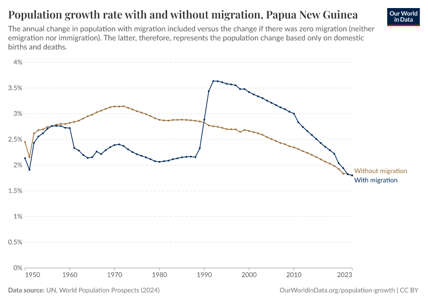 In the chart, you can see Papua New Guinea’s population change with migration, next to a scenario where migration was zero. In this case, population changes would only be determined by births and deaths.