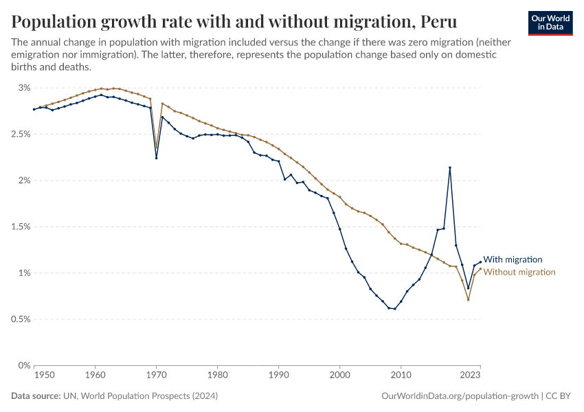 In the chart, you can see Peru’s population change with migration, next to a scenario where migration was zero. In this case, population changes would only be determined by births and deaths.