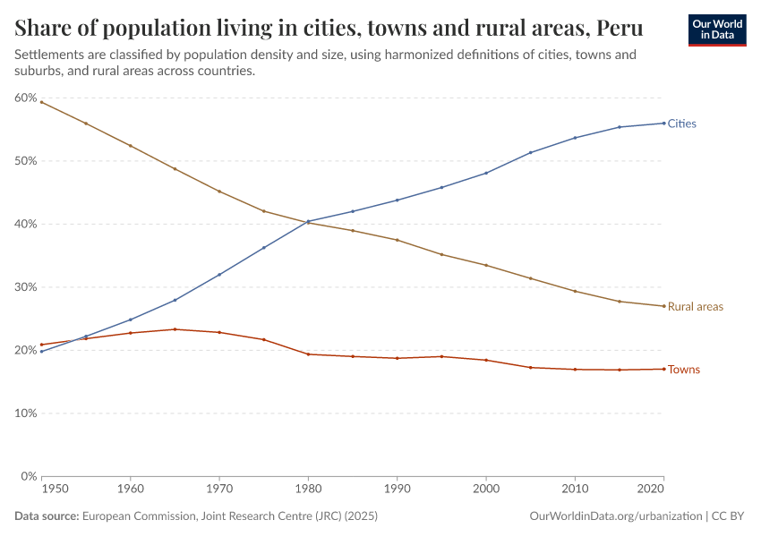 In the chart, you can see how the share of people in Peru who live in rural areas, towns, and cities has changed over time.