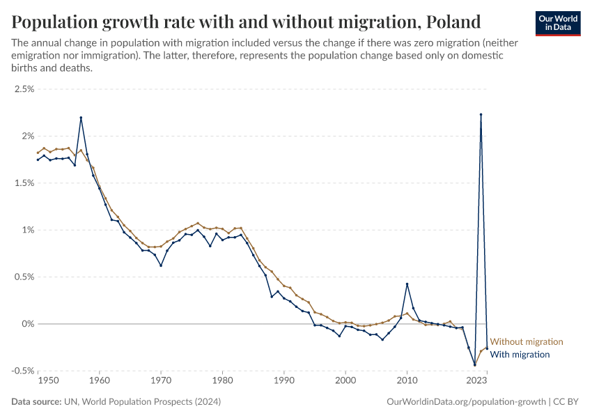 In the chart, you can see Poland’s population change with migration, next to a scenario where migration was zero. In this case, population changes would only be determined by births and deaths.