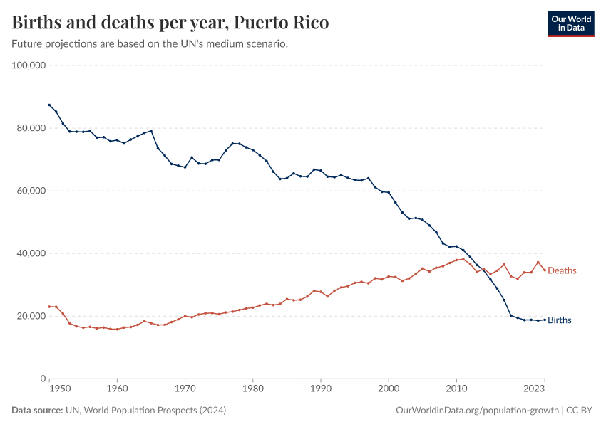 The chart below shows how births and deaths in Puerto Rico have changed over time.