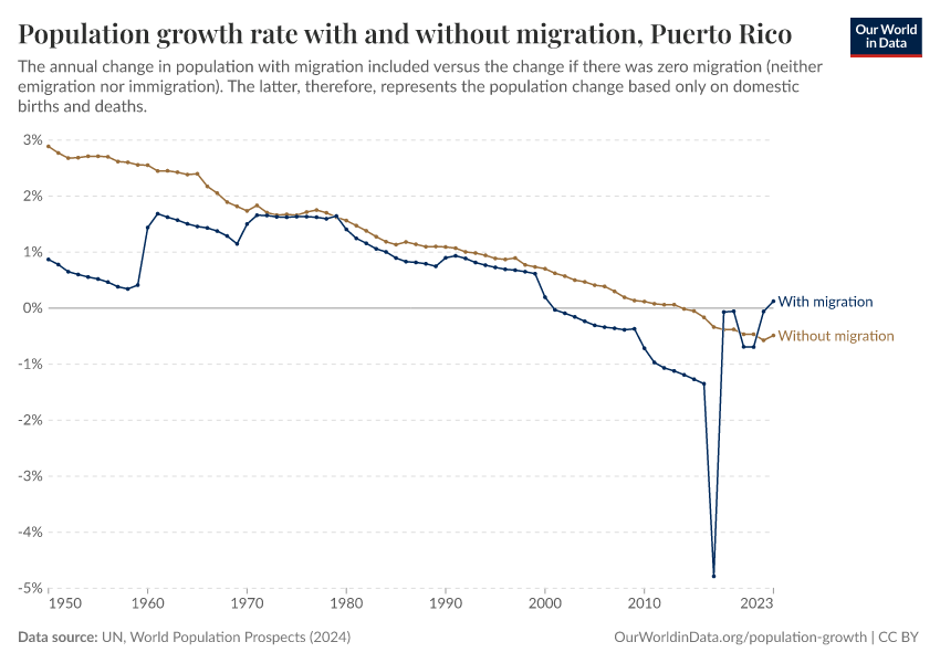 In the chart, you can see Puerto Rico’s population change with migration, next to a scenario where migration was zero. In this case, population changes would only be determined by births and deaths.