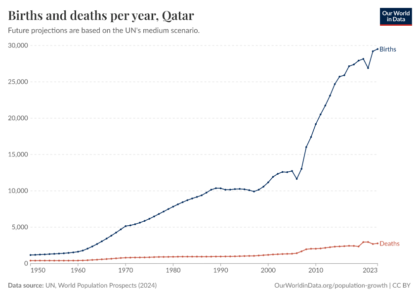 The chart below shows how births and deaths in Qatar have changed over time.