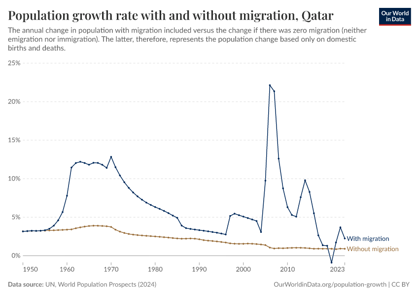 In the chart, you can see Qatar’s population change with migration, next to a scenario where migration was zero. In this case, population changes would only be determined by births and deaths.