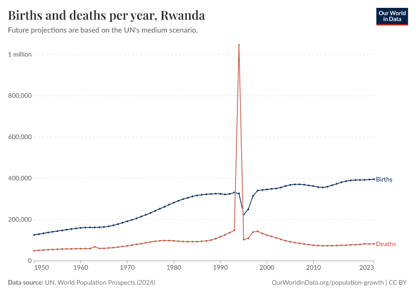 The chart below shows how births and deaths in Rwanda have changed over time.