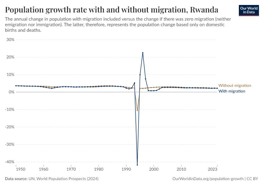 In the chart, you can see Rwanda’s population change with migration, next to a scenario where migration was zero. In this case, population changes would only be determined by births and deaths.
