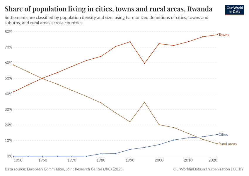 In the chart, you can see how the share of people in Rwanda who live in rural areas, towns, and cities has changed over time.