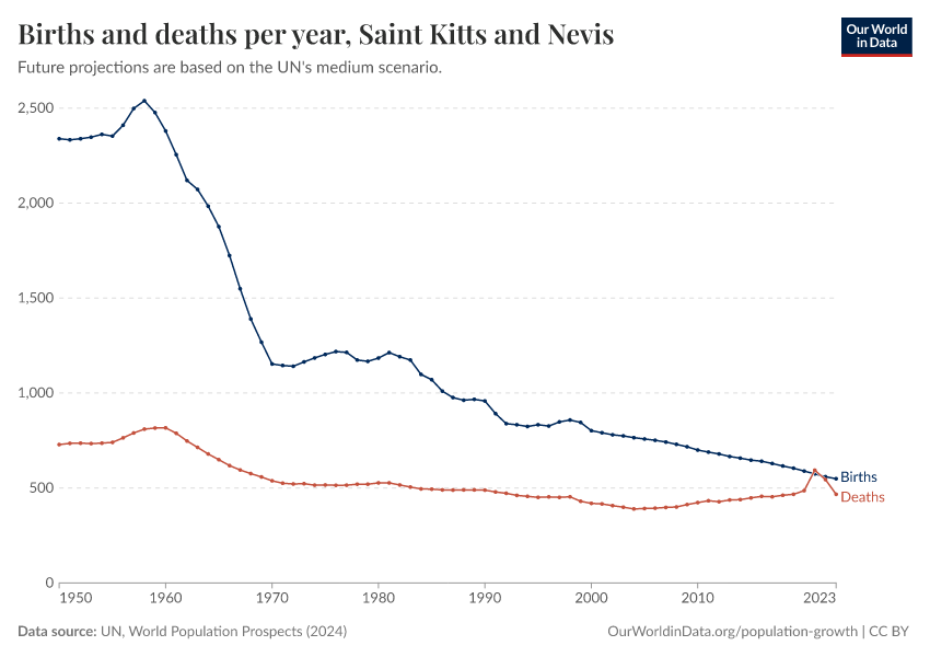 The chart below shows how births and deaths in Saint Kitts and Nevis have changed over time.
