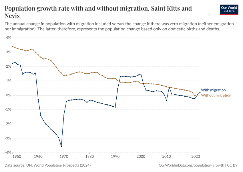 In the chart, you can see Saint Kitts and Nevis’ population change with migration, next to a scenario where migration was zero. In this case, population changes would only be determined by births and deaths.
