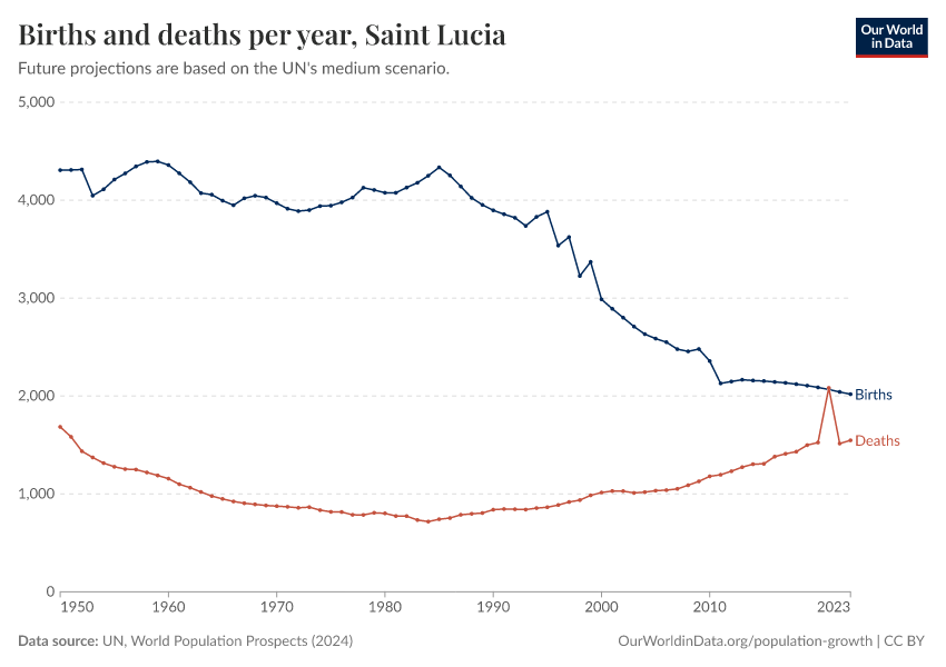 The chart below shows how births and deaths in Saint Lucia have changed over time.