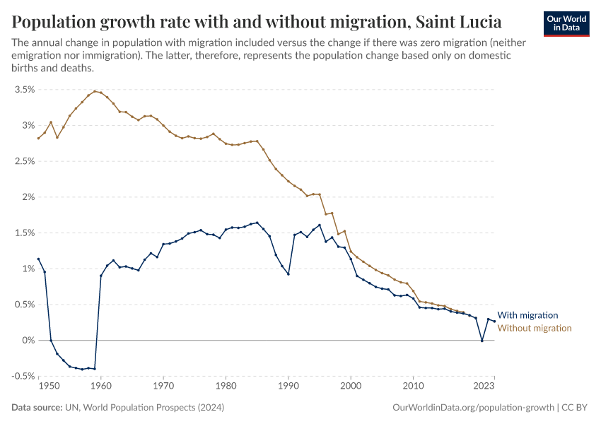 In the chart, you can see Saint Lucia’s population change with migration, next to a scenario where migration was zero. In this case, population changes would only be determined by births and deaths.