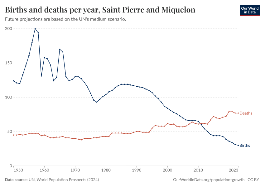 The chart below shows how births and deaths in Saint Pierre and Miquelon have changed over time.