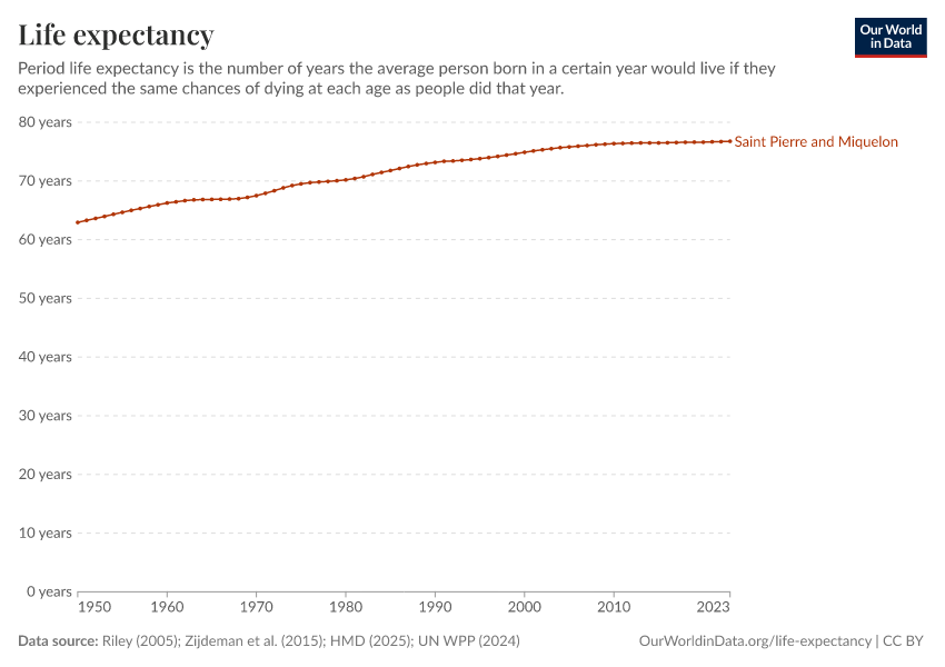 In 2023, Saint Pierre and Miquelon’s life expectancy at birth was 76.8 years.
