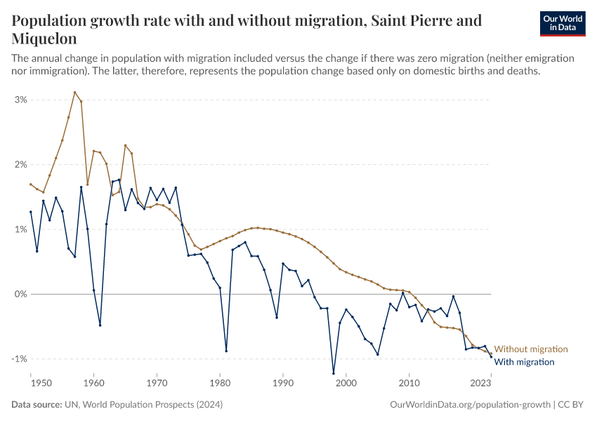 In the chart, you can see Saint Pierre and Miquelon’s population change with migration, next to a scenario where migration was zero. In this case, population changes would only be determined by births and deaths.
