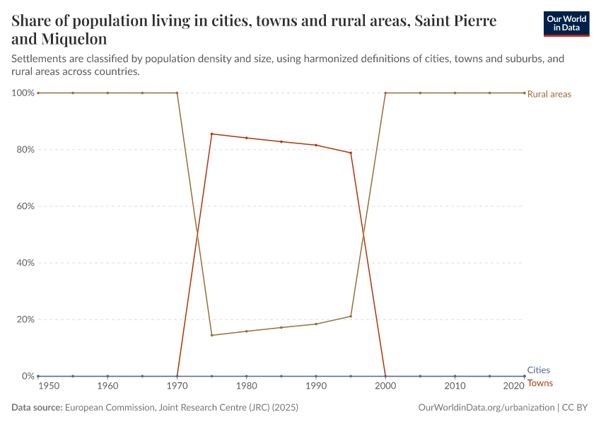 In the chart, you can see how the share of people in Saint Pierre and Miquelon who live in rural areas, towns, and cities has changed over time.