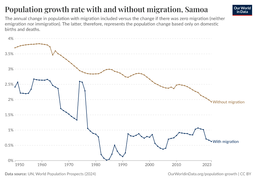In the chart, you can see Samoa’s population change with migration, next to a scenario where migration was zero. In this case, population changes would only be determined by births and deaths.
