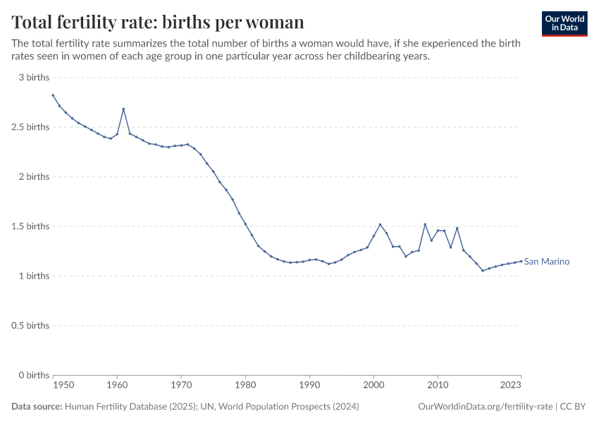 In 2023, San Marino’s total fertility rate was 1.15 births per woman.