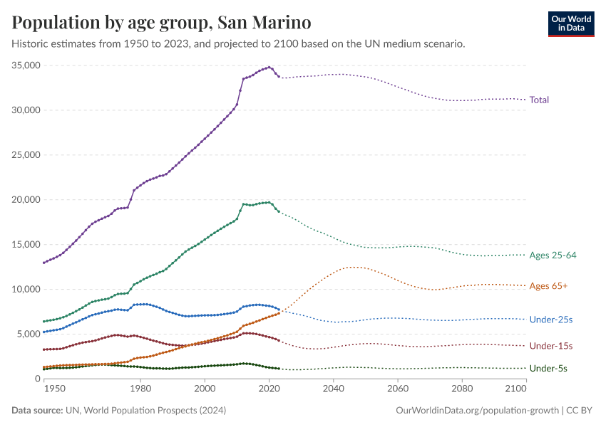 The chart below shows how the population of different age groups is projected to change in San Marino through to the end of the century. Again, this is based on the UN’s medium population scenario.