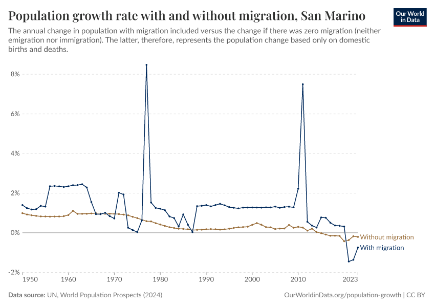 In the chart, you can see San Marino’s population change with migration, next to a scenario where migration was zero. In this case, population changes would only be determined by births and deaths.