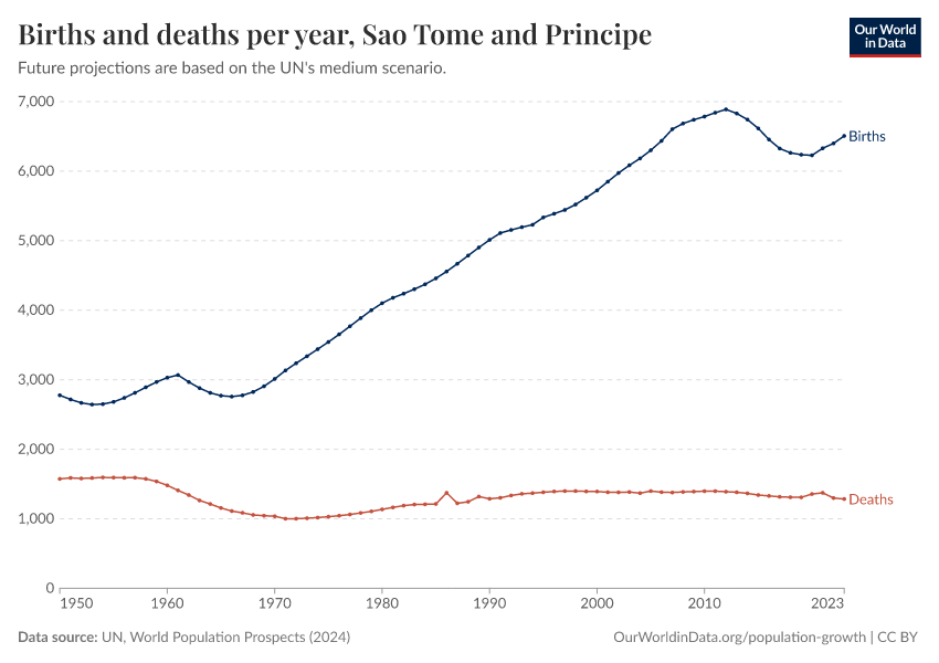 The chart below shows how births and deaths in Sao Tome and Principe have changed over time.