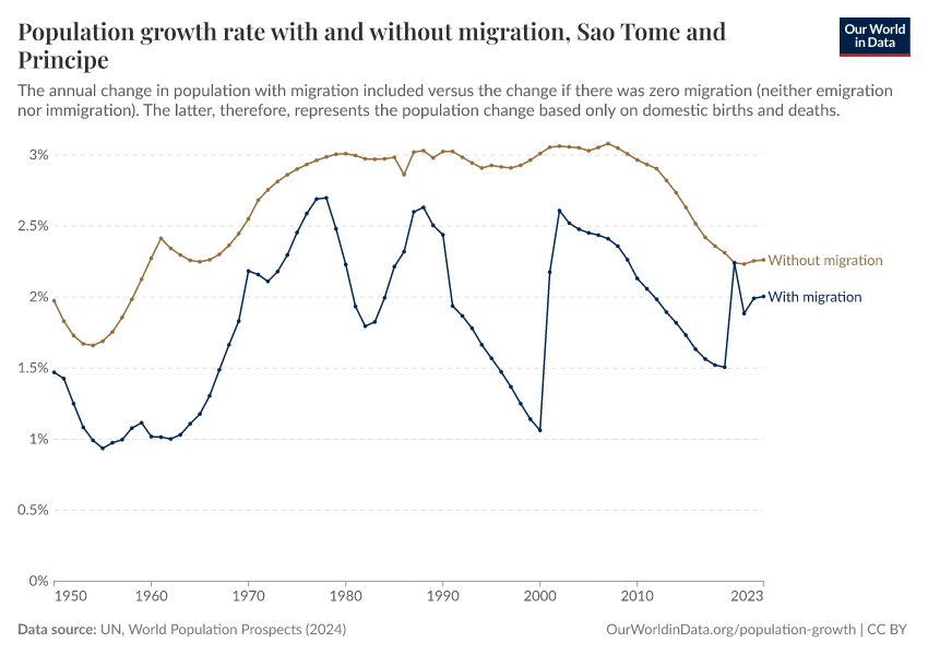 In the chart, you can see Sao Tome and Principe’s population change with migration, next to a scenario where migration was zero. In this case, population changes would only be determined by births and deaths.
