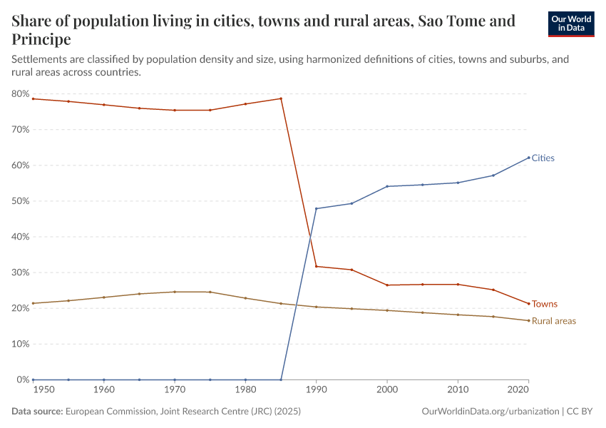In the chart, you can see how the share of people in Sao Tome and Principe who live in rural areas, towns, and cities has changed over time.