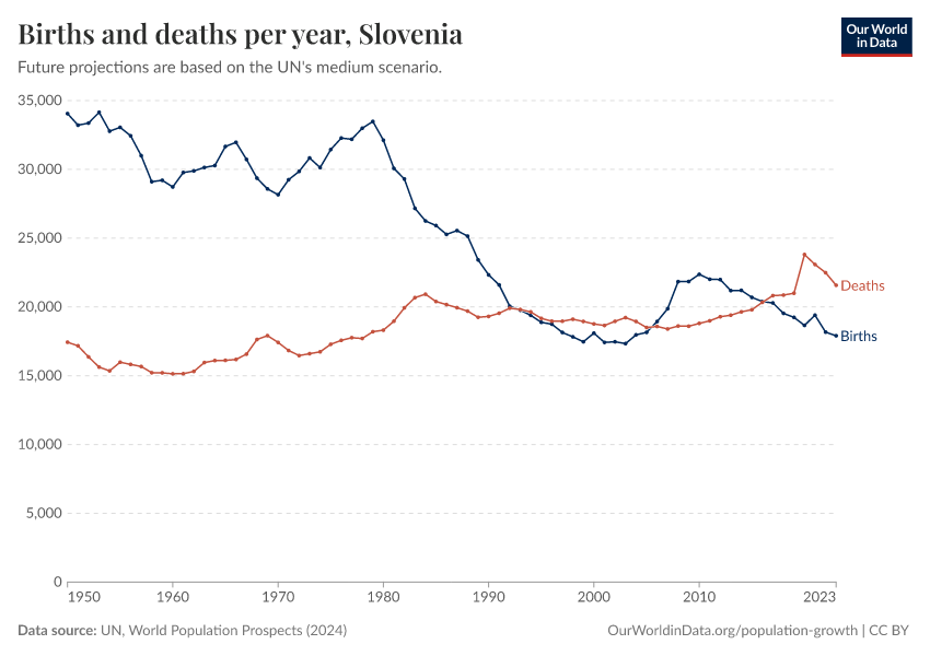 The chart below shows how births and deaths in Slovenia have changed over time.