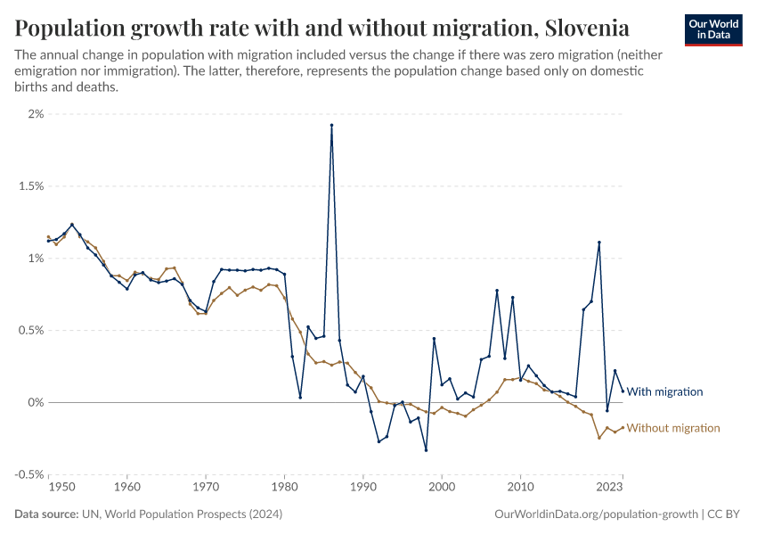In the chart, you can see Slovenia’s population change with migration, next to a scenario where migration was zero. In this case, population changes would only be determined by births and deaths.