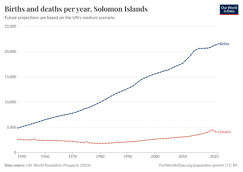 The chart below shows how births and deaths in the Solomon Islands have changed over time.