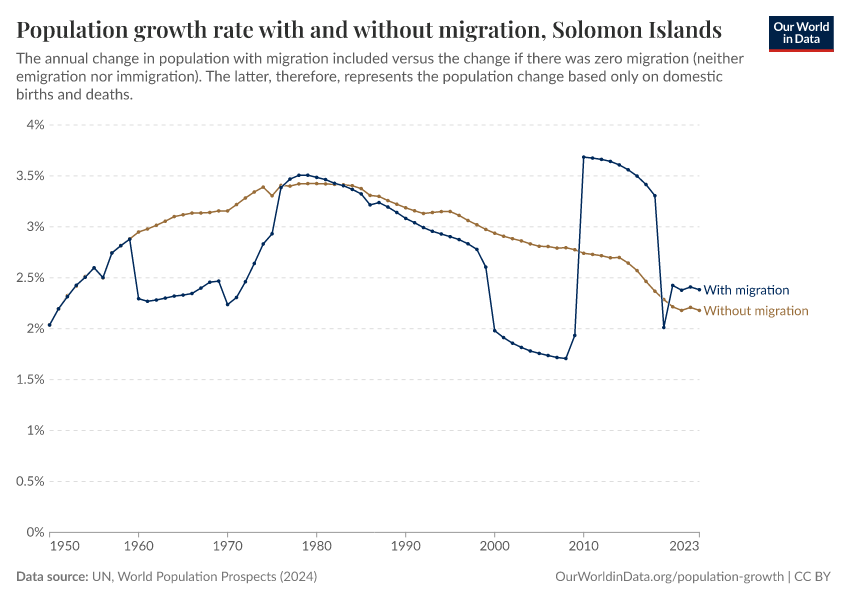 In the chart, you can see the Solomon Islands’ population change with migration, next to a scenario where migration was zero. In this case, population changes would only be determined by births and deaths.