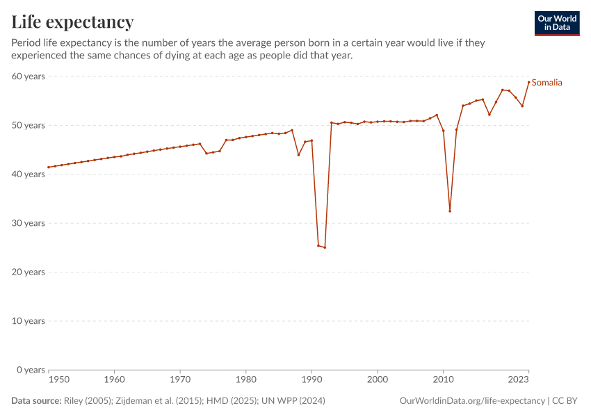 In 2023, Somalia’s life expectancy at birth was 58.8 years.