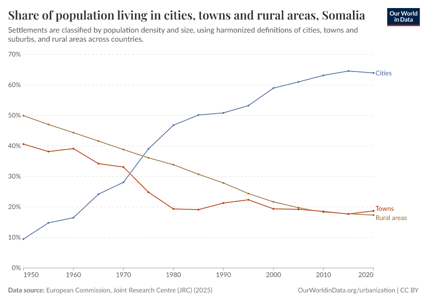 In the chart, you can see how the share of people in Somalia who live in rural areas, towns, and cities has changed over time.