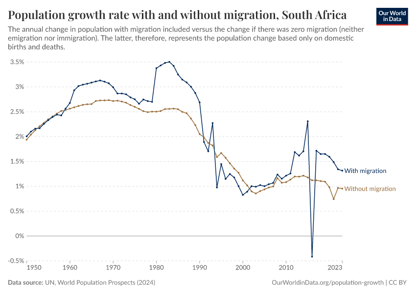 In the chart, you can see South Africa’s population change with migration, next to a scenario where migration was zero. In this case, population changes would only be determined by births and deaths.