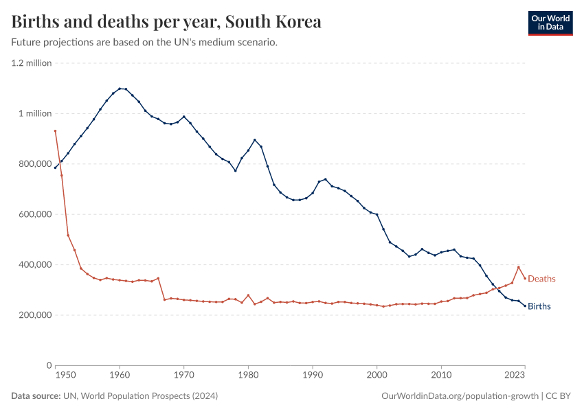 The chart below shows how births and deaths in South Korea have changed over time.