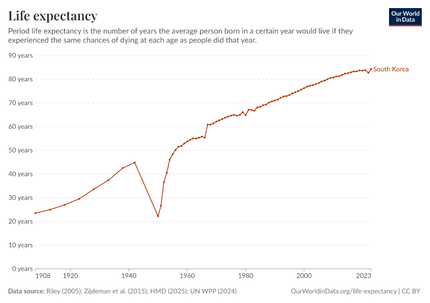 In 2023, South Korea’s life expectancy at birth was 84.3 years.