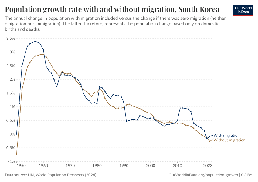 In the chart, you can see South Korea’s population change with migration, next to a scenario where migration was zero. In this case, population changes would only be determined by births and deaths.