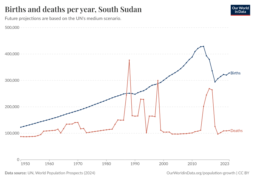 The chart below shows how births and deaths in South Sudan have changed over time.
