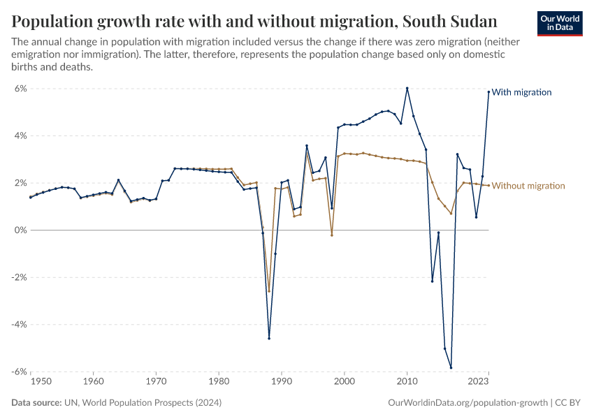In the chart, you can see South Sudan’s population change with migration, next to a scenario where migration was zero. In this case, population changes would only be determined by births and deaths.