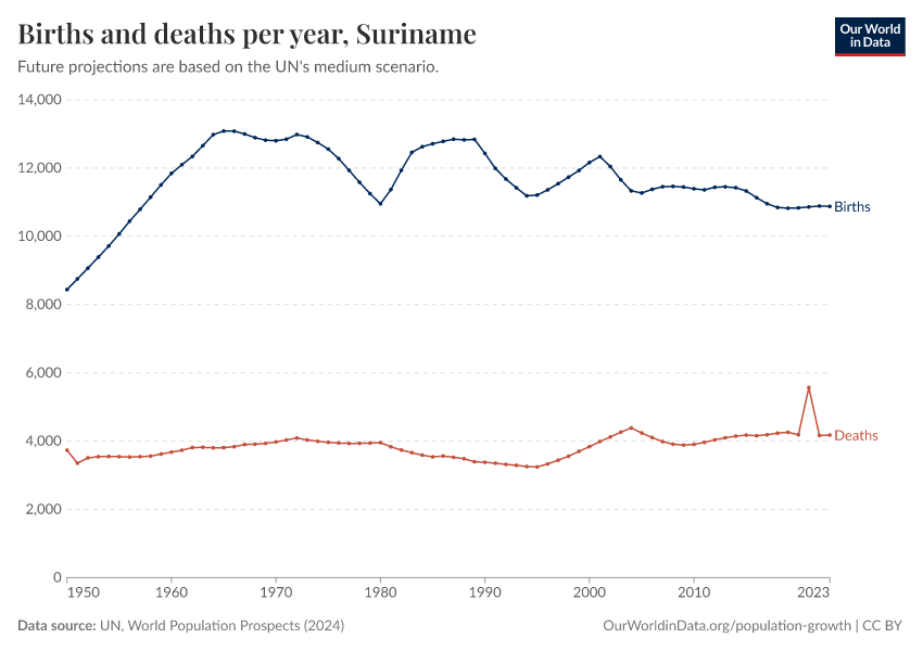 The chart below shows how births and deaths in Suriname have changed over time.