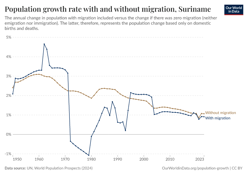 In the chart, you can see Suriname’s population change with migration, next to a scenario where migration was zero. In this case, population changes would only be determined by births and deaths.